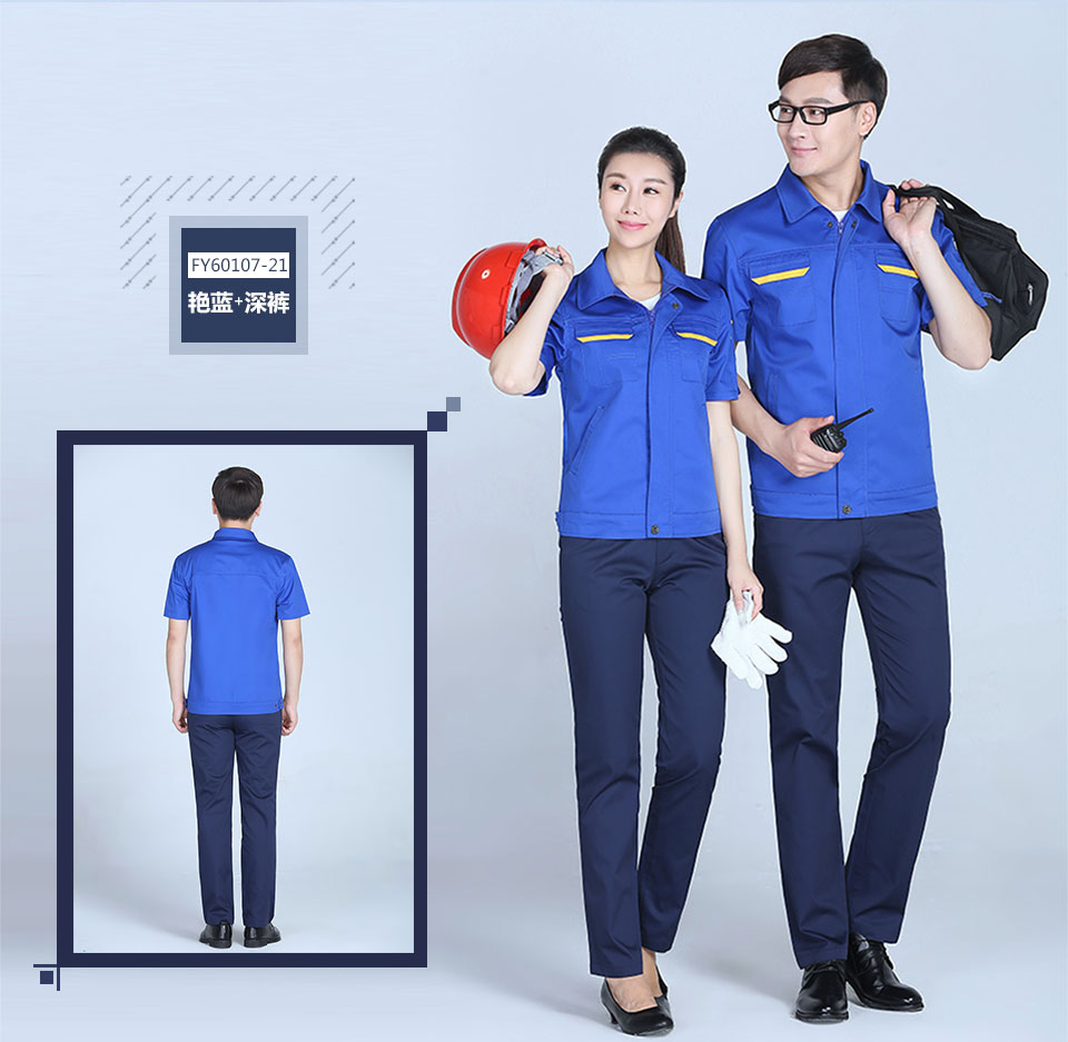 相關寶藍色滌棉拼色口袋細斜短袖工作服FY601推薦